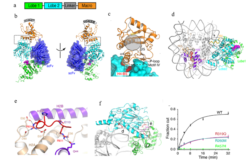 In eukaryotes, the genomic DNA is wrapped around histones to form nucleosomes, which are further assembled into chromatin. Packages of the chromatin within the nucleus block access to the DNA. Chromatin remodelers alter the positions and compositions of nucleosomes, regulating the chromatin structure and various nuclear transactions. Tight control of the activity of remodeling enzymes ensures the proper chromatin landscape and cellular functions. ALC1, a member of the Snf2 superfamily ATPases, contains two RecA-like ATPase domains (lobe 1 and lobe 2) and a C-terminal macro domain (Fig a). ALC1 relaxes chromatin and plays an important role in the poly (ADP-ribose) polymerase 1 (PARP1)-mediated DNA repair pathway. With DNA damage, PARP1 is activated and catalyzes the synthesis of poly (ADP-ribose) (PAR) chains on itself and on many other proteins. The PAR chains are bound to the macro domain of ALC1, releasing the autoinhibition of ALC1 and targeting the remodeler to the sites of DNA damage, where ALC1 slides the nucleosome and opens the chromatin.