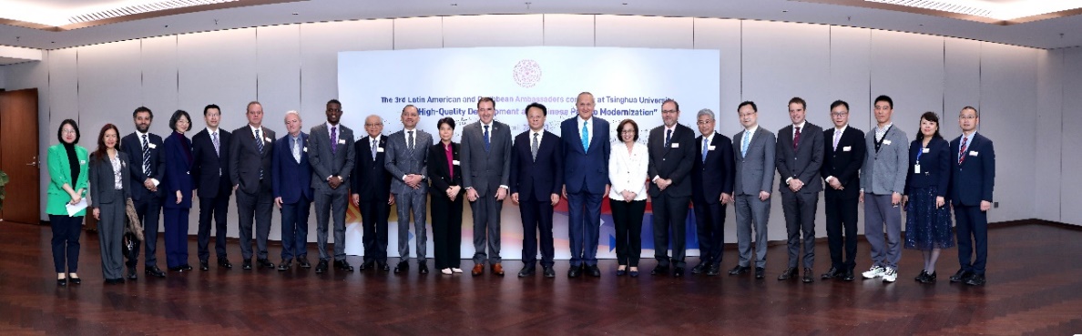 On April 28, Latin American and Caribbean ambassadors to China convened at the Jianhua Building of the School of Economics and Management at Tsinghua University to explore the theme “High-Quality development and Chinese Path to Modernization”. More than 30 diplomatic envoys and representatives from the embassies and institutions from 20 Latin American and Caribbean countries attended the event. President of Tsinghua University Wang Xiqin, Head of the Mission from Latin America and Caribbean and Ambassador of Uruguay to China H.E. Fernando Lugris, and former Chinese ambassador to Peru H.E. Liang Yu delivered opening speeches. Vice President of Tsinghua University Wang Hongwei delivered the closing remarks. Dean of International Affairs of Tsinghua University Li Jinliang, and Director of the Latin America Center Chen Taotao, jointly hosted the event.