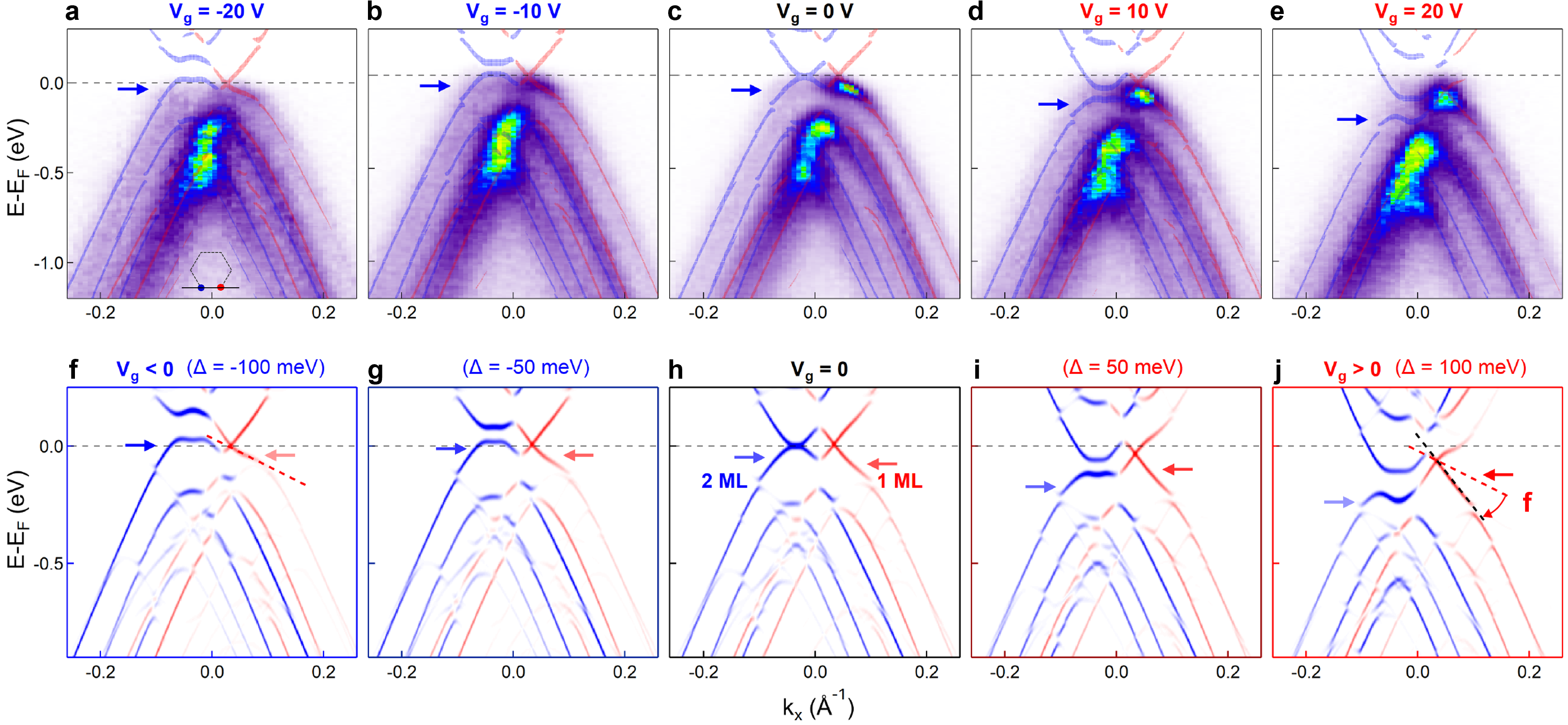 Fig. 2 Evolution of flat band electronic structure of twisted monolayer-bilayer graphene under electric field. (a-e) NanoARPES measured evolution of electronic structures under different electric fields. The measurement direction cutting through both monolayer and bilayer graphene K points, as shown in the inset in (a). (f-j) Calculated evolution of electronic structure under different electric fields, which is consistent with the experimental observation in (a-e).