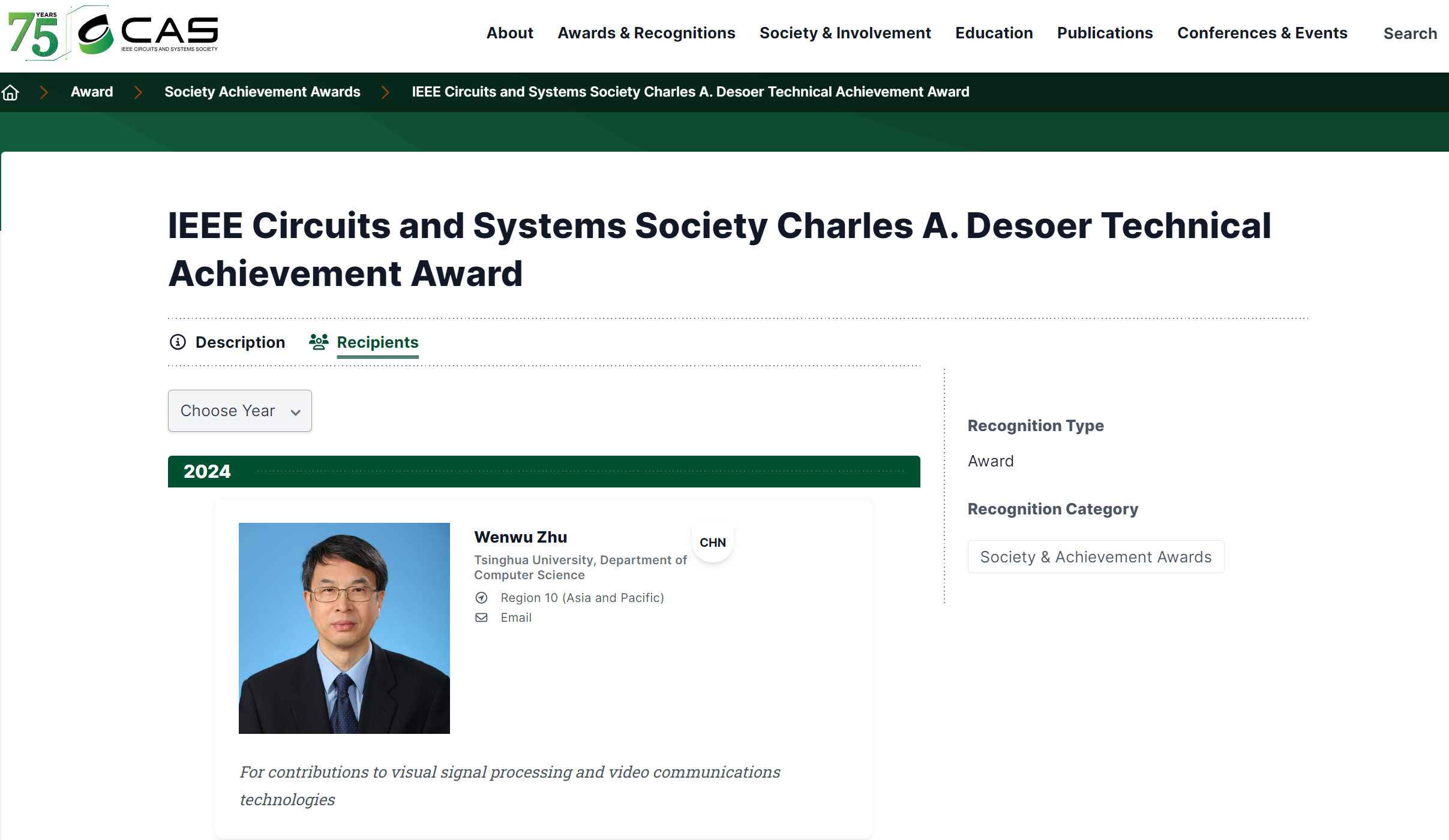 ​Professor Zhu Wenwu from the Department of Computer Science and Technology Receives IEEE Circuits and Systems Society Charles A. Desoer Technical Achievement Award