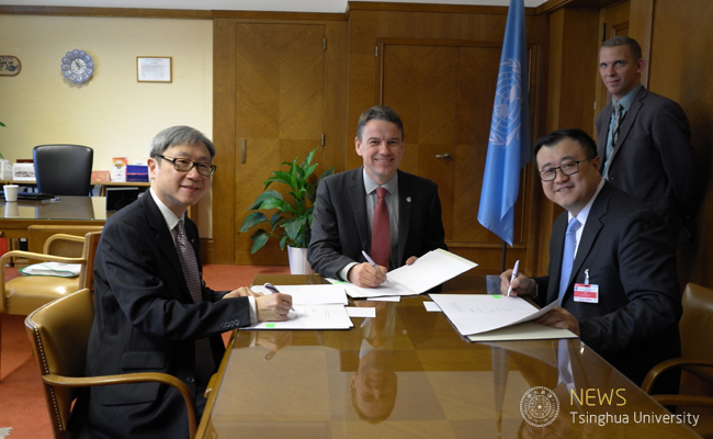 Tsinghua Vice President and Provost Yang Bin, CityU Vice President Horace Ho-shing IP, and UNECE Executive Secretary Christian Friis Bach signed the founding agreement.