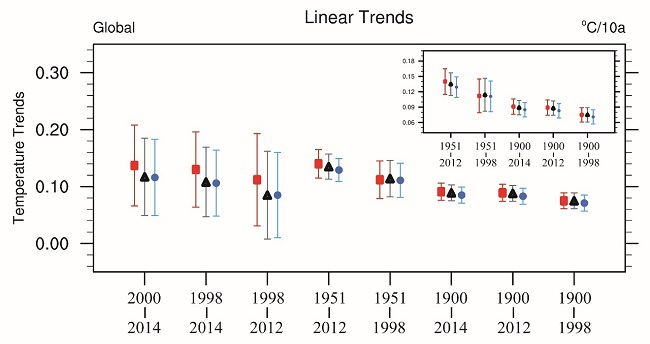 Linear trends and associated uncertainties in the global mean annual SAT data based on reconstructed Arctic temperatures during the eight time periods of our interest are shown in the figure. In the inset, the results of the latter five periods are zoomed in. The results from the annual mean temperature change rate of NOAA for reconstruction (filled black triangles), the monthly mean temperature change rate of the original NOAA (filled blue circles) and the global mean temperature change rate after the Arctic temperature reconstructed in this paper (filled red squares) are shown here. Color bars denote a 90% confidence interval. (Unit: ℃/10 years)