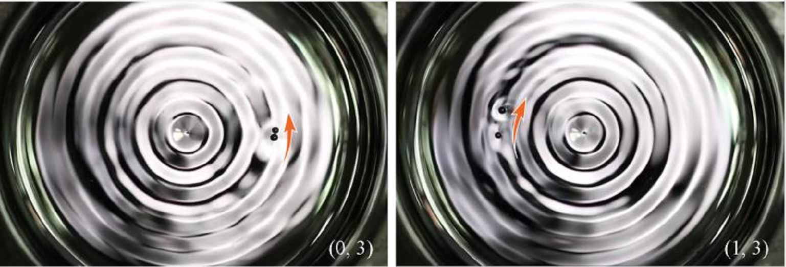 The team built a macroscopic hydrodynamic "quantum" system with two pilot-wave fields. One pilot-wave field, which consisted of level-split global orbits, was formed by a shaking bath, while the other was created locally by bouncing liquid metal droplets. The researchers found that two dissimilar droplets immediately started chasing each other once they met in the orbits, and the distance between the two droplets remained interlocked. Moreover, the orbit level and the interlock distance between the two droplets only took quantized values.