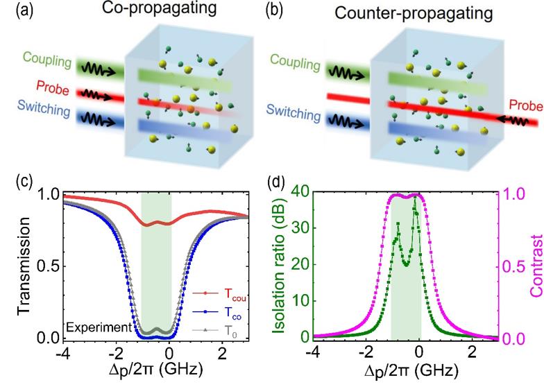 FIG.  1 Schematic diagram of the experiments and typical experimental results. (a)(b) are the schematic diagram of the experiments setting. (a) for copropagating and (b) for counterpropagating. (c) is the experimental results for the probe laser transmission spectra with corresponding isolation and contrast ratio shown in (d). The bandwidth for isolation ratios greater than 20 dB is denoted by shaded regions in (c) and (d).