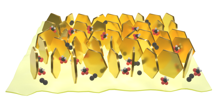 The team’s new catalyst, composed of MoS2 (hexagons) growing vertically on Co9S8 (yellow base), has large number of exposed, active edge sites.