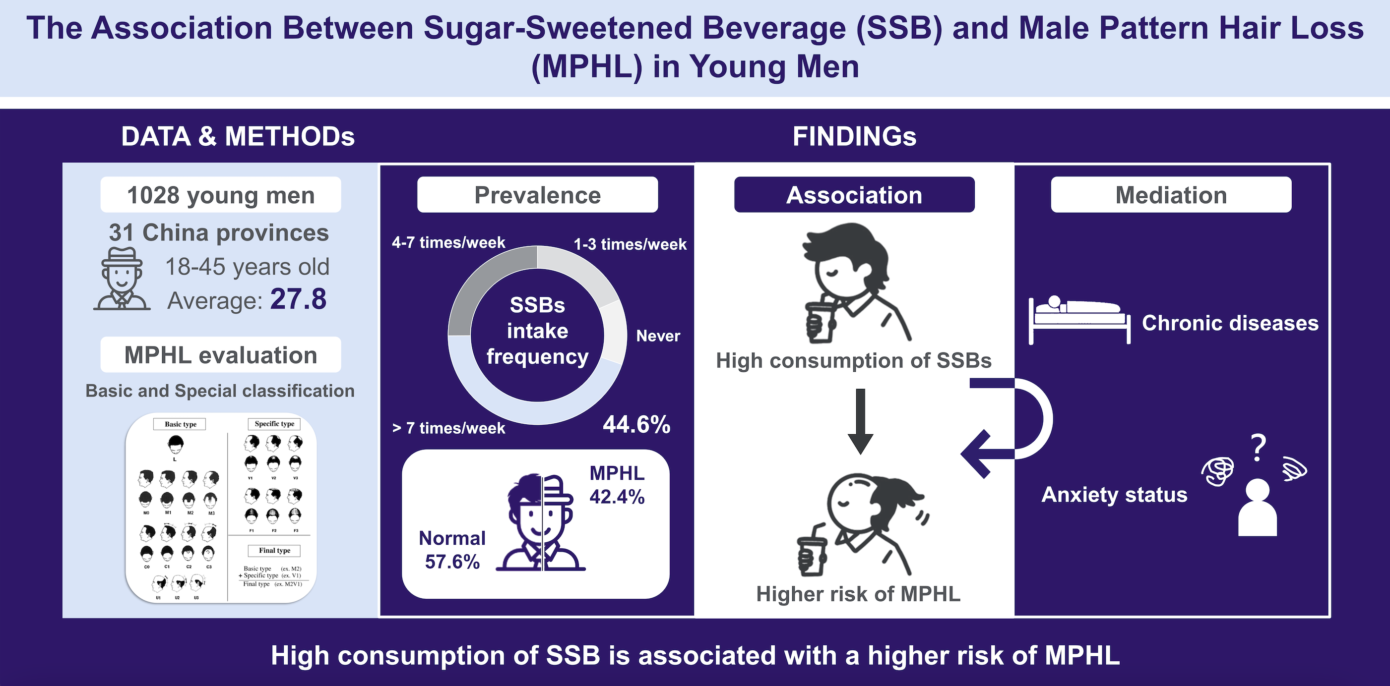 1. Shi, X., Tuan, H., Na, X., Yang, H., Yang, Y. et al. The Association between Sugar-Sweetened Beverages and Male Pattern Hair Loss in Young Men Nutrients 15(1), 214 (2023) doi: 10.3390/nu15010214