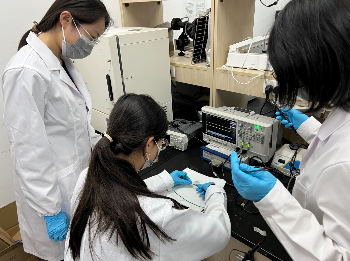 Researchers at Tsinghua University’s School of Material Science and Engineering check their biodegradable batteries.