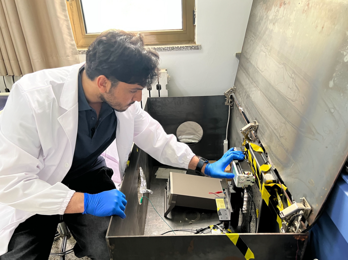 A member of Lan Yin’s team, Abdul Aziz, checks a device wirelessly receiving data from an implanted, biodegradable sensor.