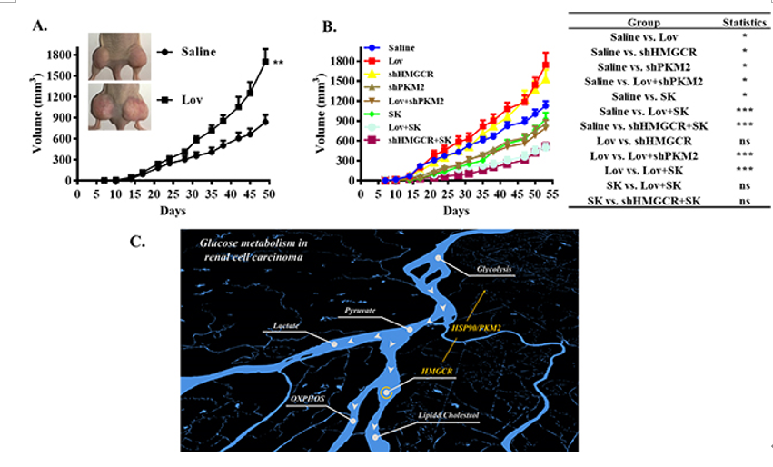 In this study, the Shengli Mi team demonstrated that the inhibition of 3-Hydroxy-3-methylglutaryl coenzyme A reductase (HMGCR) could accelerate the development of RCC tumors by lactate accumulation and angiogenesis in animal models. HMGCR plays a pivotal role in RCC development as it is the key rate-limiting enzyme of the cholesterol biosynthetic pathway. The group identified that the inhibition of HMGCR led to an increase in glycolysis via the regulated HSP90 expression levels, thus maintaining the levels of a glycolysis rate-limiting enzyme, pyruvate kinase M2 (PKM2). Based on these findings, they reversed the HMGCR inhibition-induced tumor growth acceleration in RCC xenograft mice by suppressing glycolysis. Furthermore, the co-administration of Shikonin, a potent PKM2 inhibitor, reverted the tumor development induced by the HMGCR signaling pathway.