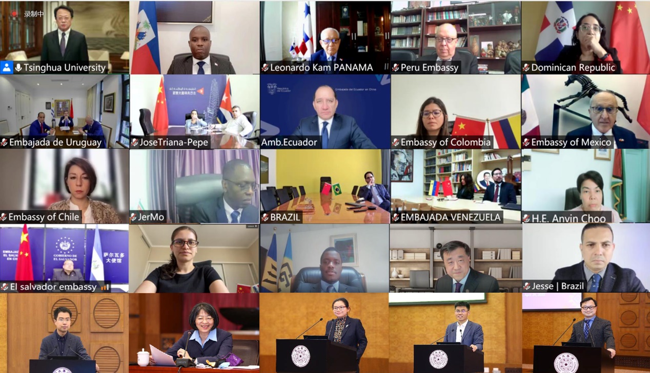 On April 29, 2022, Digital China and Online Education Cooperation—Cloud Dialogue between Tsinghua University and Latin American and Caribbean Ambassadors was held successfully. More than 30 Latin American and Caribbean ambassadors and representatives attended the online event. Wang Xiqin, President of Tsinghua University, and Fernando Lugris, Uruguayan Ambassador to China and Dean of the Latin American and Caribbean Group delivered opening speeches. Yang Bin, Vice President and Provost of Tsinghua University, made the closing remark. Li Jinliang, Dean of International Affairs, Tsinghua University, served as the moderator of the event.