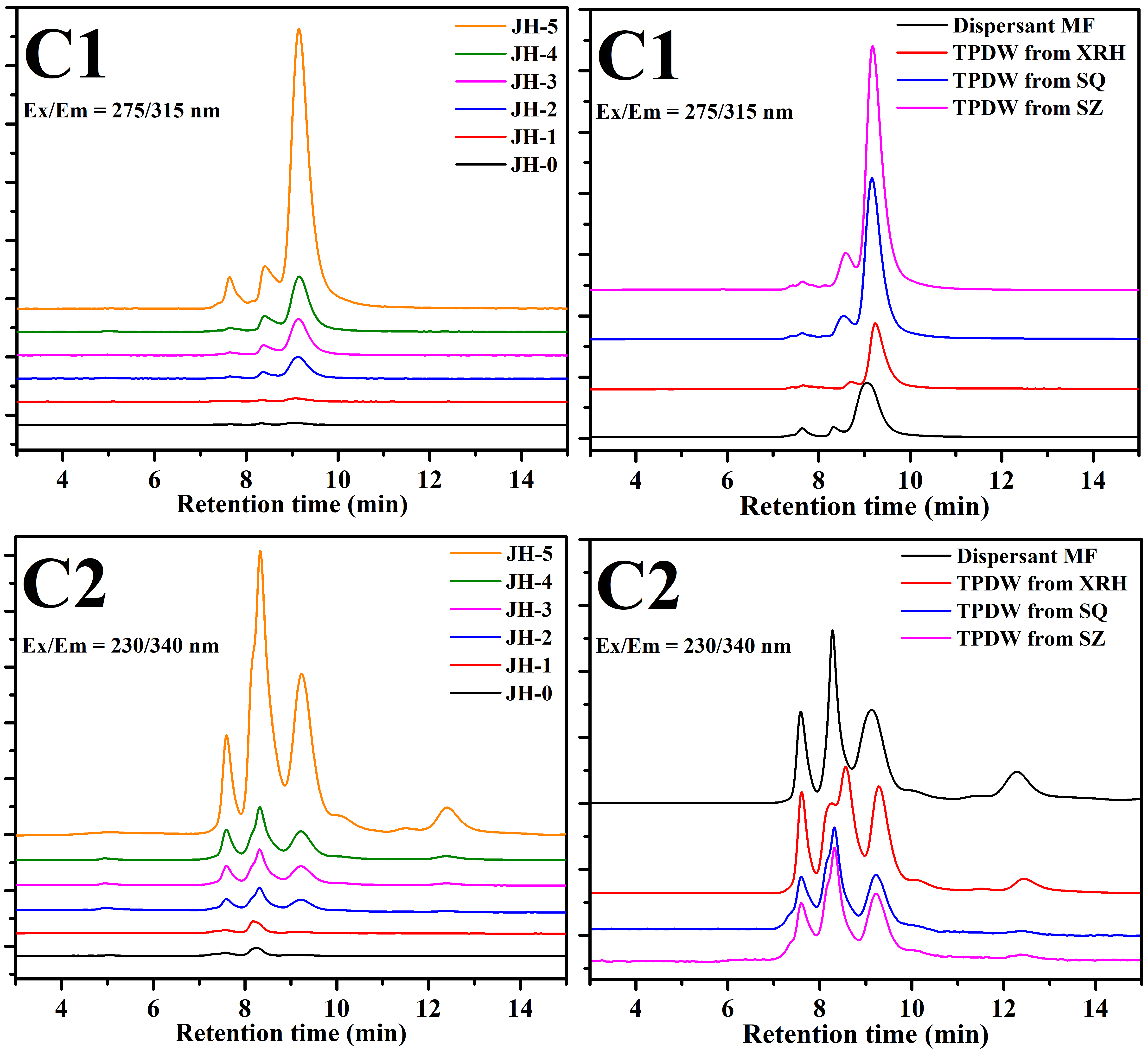 Figure 2 Apparent molecular weight distribution characteristics of fluorescent dissolved organic compounds in the water body of Beijing-Hangzhou Grand Canal in southern Jiangsu region (JH-0 to JH-5), textile printing and dyeing wastewater (XRH, SQ, SZ), and Dispersant MF at specific fluorescence excitation/emission wavelength pairs (C1: Ex/Em = 275/315 nm; C2: Ex/Em = 230/340 nm)