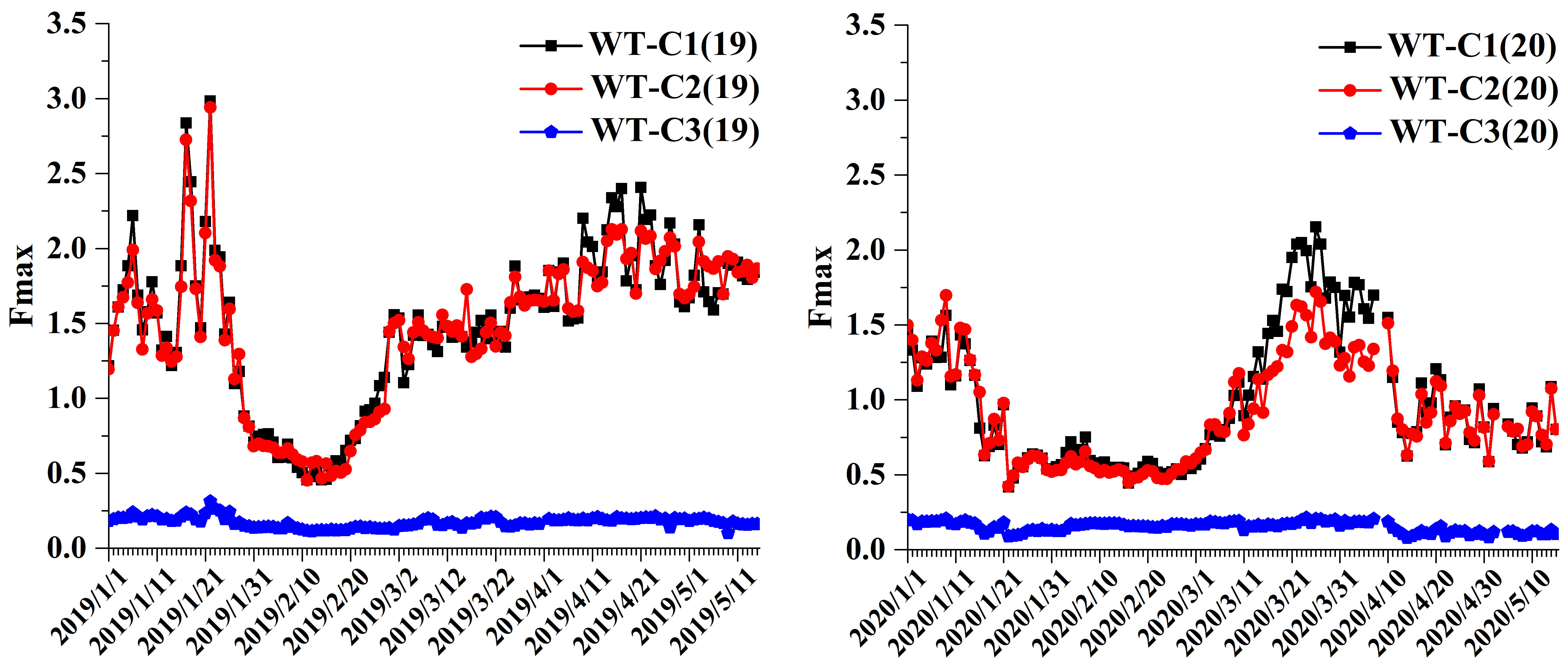 Figure 3  Intensity variations of three fluorescent components in water bodies at a monitoring sections of Beijing-Hangzhou Grand Canal in southern Jiangsu region from January 1 to May 15 in 2019 and 2020, respectively