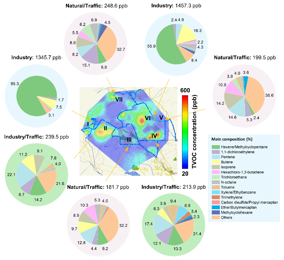VOCs, as a typical kind of the air pollutants, are generated from a variety of artificial sources. The abundance and spatial distribution of easily diffusible VOCs are affected by factors of emission rate, pollution source distribution, and meteorological conditions, with significant spatiotemporal variability, which pose challenges to effective VOC regulation. Therefore, it is crucial for source identification and abatement of atmospheric VOCs via regional high-density monitoring of VOCs.