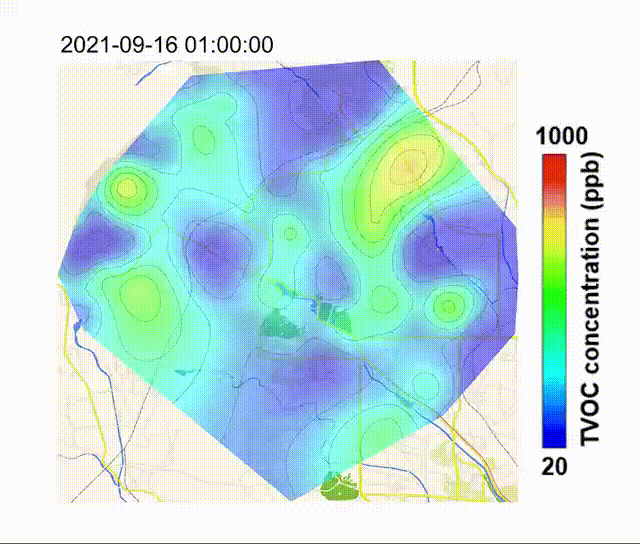 Sensor arrays were used for atmospheric TVOC monitoring network. The research group set up a network contained 152 sets of TVOC monitors in a mixed-use land area (such as industrial areas, residential areas, and urban roads) of approximately 55 square kilometers. The monitoring results can accurately and timely describe the spatiotemporal characteristics of local TVOC concentrations, identify VOC emission sources, and guide emission abatement. In addition, types of pollution sources can also be clarified by joint vehicle-mounted GC-MS detecting results, which verify the results of the TVOC monitoring network.