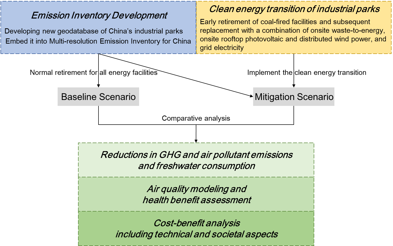 This study developed a geodatabase covering energy supply, greenhouse gas emissions, atmospheric pollutants and freshwater consumption for 850 industrial parks in China. By integrating methods such as energy system analyses, a life cycle assessment, air quality simulations, health impact assessment, and cost-benefit analyses, this study quantitatively revealed the carbon mitigation potential, freshwater conservation, air quality improvements, and human health benefits associated with the clean energy transition in industrial parks. The study also identified the technical costs and social benefits resulting from the energy transition. Specific measures for the clean energy transition in industrial parks include: (1) early retirement of coal facilities; (2) promotion of municipal solid waste incineration for heating/power generation; (3) deployment of rooftop photovoltaics and distributed wind power; (4) purchasing grid electricity.