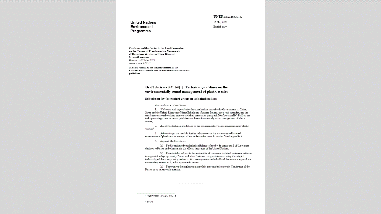 The 2023 meetings of the Conferences of the Parties (hereinafter referred to as “COP”) to the Basel, Rotterdam, and Stockholm Conventions (hereinafter referred to as “BRS Conventions”) convened in Geneva, Switzerland, from May 1-12, attracting around 2,000 delegates from more than 160 countries. As members of the Chinese delegation, TAN Quanyin, assistant professor of School of Environment, Tsinghua University, ZHAO Nana, assistant director of the Basel Convention Regional Centre for Asia and the Pacific (hereinafter referred to as “BCRC China”), and ZHANG Yujiao, research assistant of BCRC China, participated in the meetings. Following 11 days of intense negotiations, the plenary successfully deliberated and adopted the Technical guidelines on the environmentally sound management of plastic wastes (hereinafter referred to as the “Technical guidelines”).