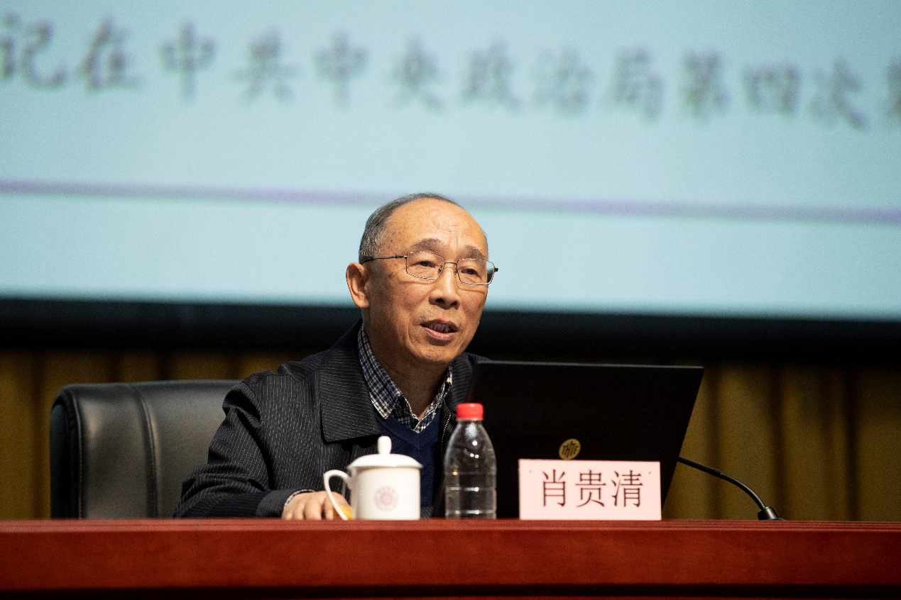 动员部署会后,马克思主义学院教授肖贵清应邀作“马克思主义中国化时代化新的飞跃”专题辅导报告。校党委副书记向波涛主持报告会。肖贵清回顾了习近平新时代中国特色社会主义思想的形成背景,系统阐释了习近平新时代中国特色社会主义思想的理论体系和世界观方法论,并对习近平新时代中国特色社会主义思想如何开辟马克思主义中国化时代化新境界进行了深入解读。