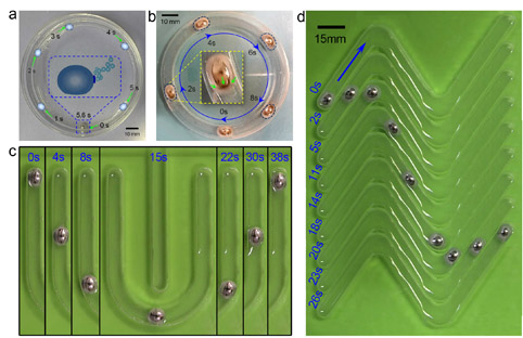 可变形液态金属机器在内含电解液的容器或各种槽道中的自主运动情形。
