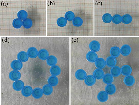 最近,在清华学堂计划“钱学森力学班”项目首席教授郑泉水指导下,这个困惑被钱学森力学班大三年级的学生薛楠等为主的研究组破解了。他们的研究结果表明,颗粒之间的横向液桥,配合由于接触角迟滞所导致的钉扎,产生了不完善筏的机制。利用这个最新发现,他们还展示了如何利用毛细力来组装各自远离平衡态的不同的悬浮颗粒组装形态(图2)。