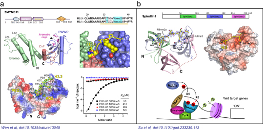图1. a) 组蛋白H3.3K36me3被ZMYND11串联Bromo-ZnF-PWWP结构域识别;b)组蛋白H3“K4me3-R8me2a”被Spindlin1串联Spin/Ssty结构域组合识别。