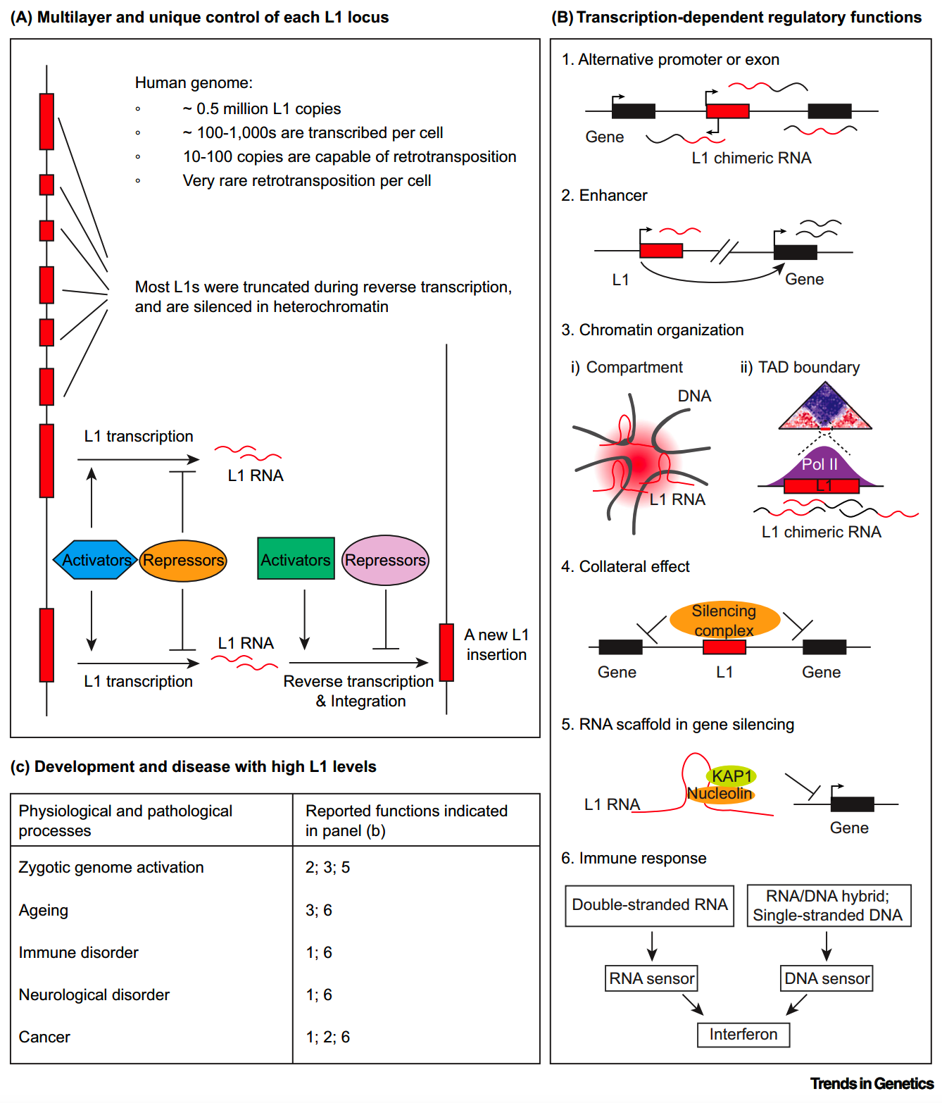 图3.基因组LINE-1(L1)元件、其转录依赖性调控功能及其在生理和病理环境中的作用