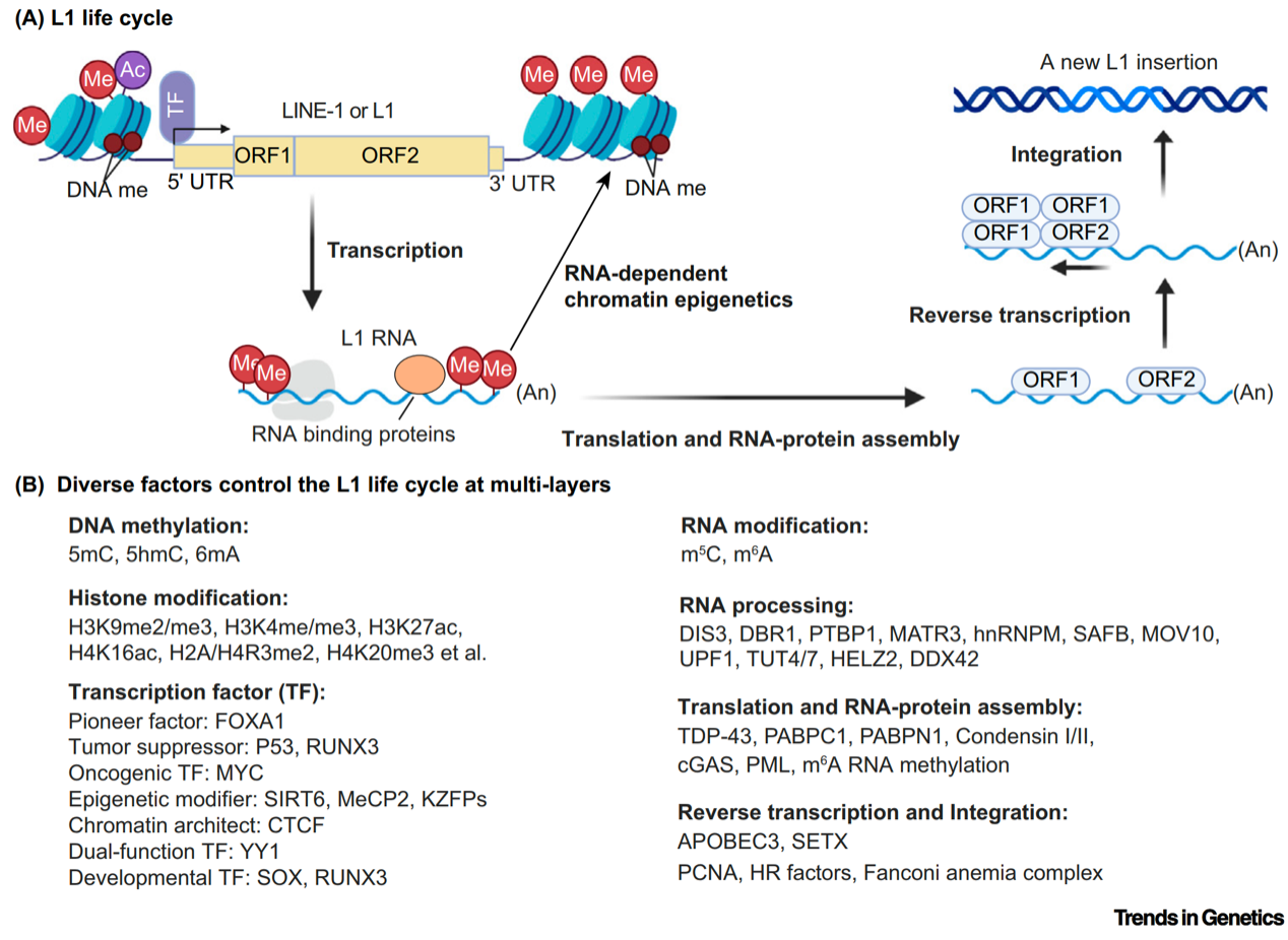 图2.功能各异的因子对 LINE-1(L1)逆转录的多层次调控。(A)L1逆转录过程。(B)在不同水平调控L1的代表性基因和蛋白复合物