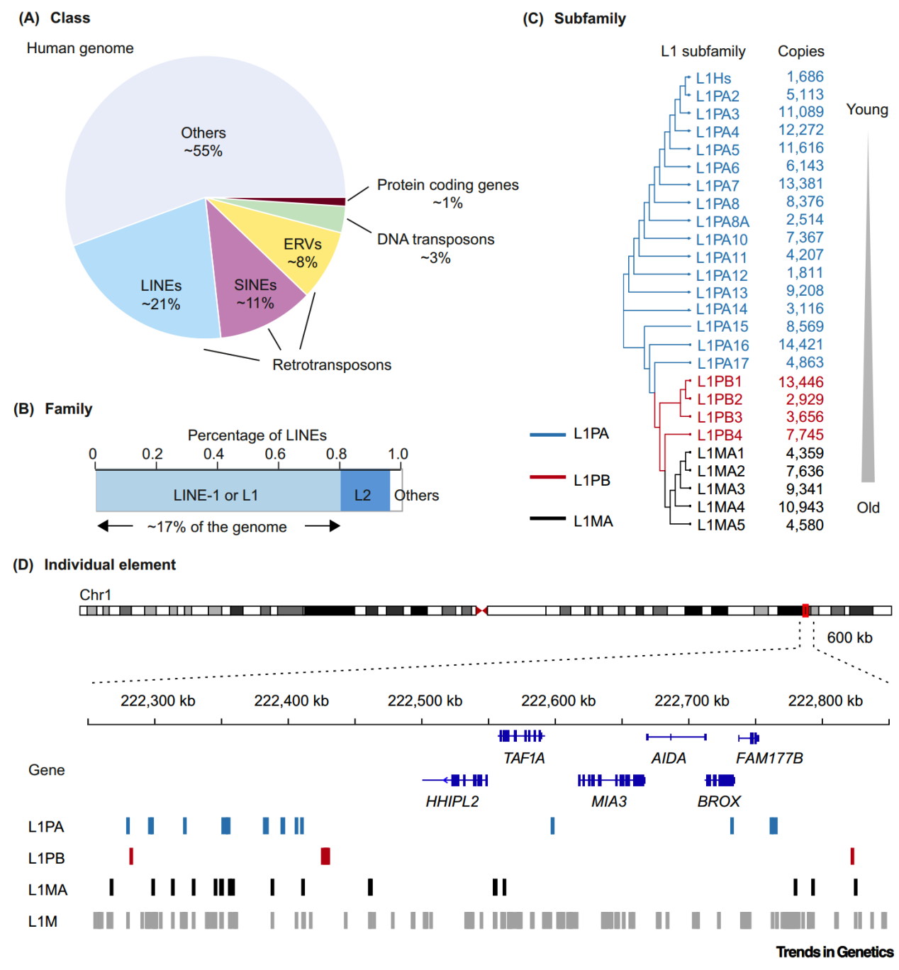 图1.LINE-1(L1)元素分散在基因组中,包括各种家族、亚家族、长度和序列