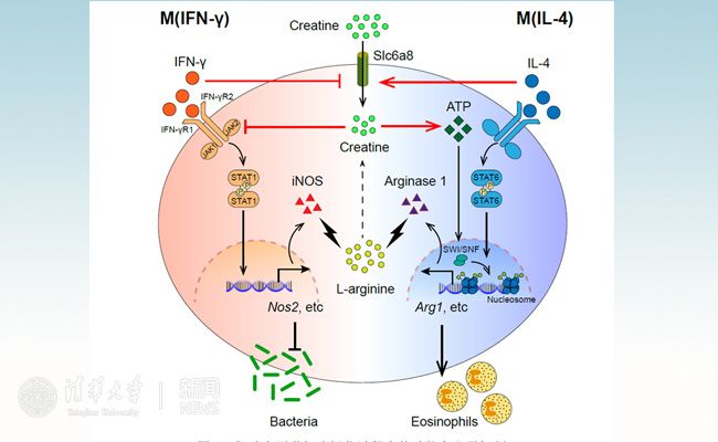 清华新闻网8月7日电 2019年8月6日,beat365官方唯一入口医学院胡小玉课题组联合药学院陈立功课题组在《细胞》(Cell)子刊《免疫》(Immunity)杂志在线发表了题为 《Slc6a8介导的肌酸转运和积累通过调控细胞因子应答来重编程巨噬细胞的极化》(Slc6a8-mediated creatine uptake and accumulation reprogram macrophage polarization via regulating cytokine responses)的研究论文。该文章揭示了L-精氨酸的下游代谢产物肌酸在干扰素IFN-γ介导的巨噬细胞活化[M(IFN-γ)]和白介素IL-4介导的巨噬细胞活化[M(IL-4)]中分别发挥着关键调控作用。