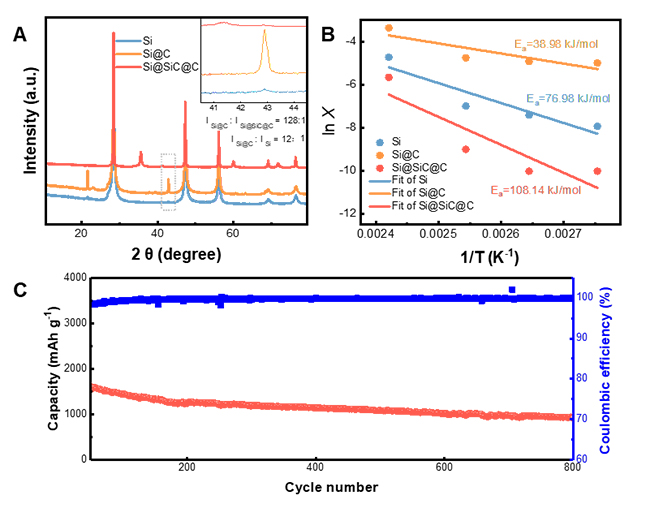 为了抑制这一副反应的发生,在Si表面包覆一层致密的纳米级厚度碳化硅陶瓷层,阻止氟化物的渗入并稳定硅负极的体积膨胀以达到抑制副反应、稳定SEI层的目的。包覆SiC陶瓷层后,副反应的活化能变为原来的三倍,对应的室温下的反应速率降为原来的1/300。通过在实际的电池体系下进行电化学性能测试,包覆SiC后的材料循环稳定性得到大幅度提高。上述成果可望为Si基负极材料的稳定性研究提供一种新的解决思路,推进硅基负极材料的商用化。