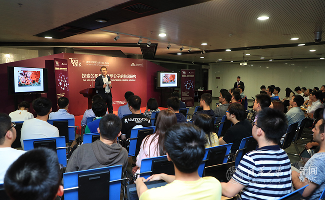 费林加教授首先从来源于日常生活中的一些有趣的化学问题切入,来引导同学们发现化学与生活的密切联系。接着教授通过介绍一些人体内本身存在的分子开关,以及纳米分子合成技术的发展现状及应用,引出了合成纳米级别的分子马达的设想并解释了其工作原理。分子小车用于医学领域,可以检测人体内的癌细胞,定向运送药物;用于工业领域,可以实现玻璃、太阳能电池板等的自我清洁。最后,费林加教授鼓励同学们勇于发掘自身的才能,在科研的大千世界里不断发现、创造新的事物。