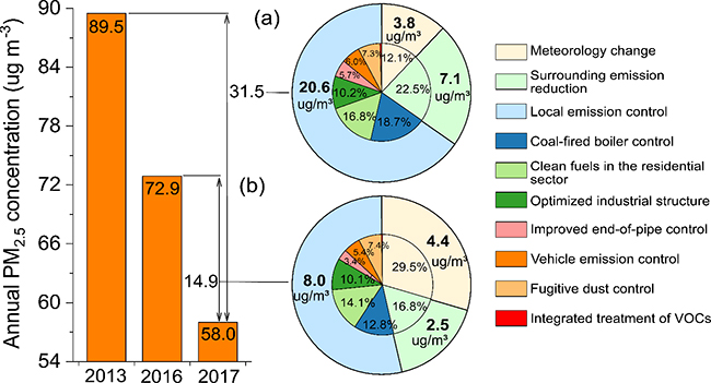 清华新闻网5月16日电 为改善空气质量,我国政府于2013年发布了《大气污染防治行动计划》(即“大气十条”),其中要求2017年北京市年均PM2.5浓度达到60μg/m3。为完成这一艰巨目标,北京市及周边地区先后实施了一系列大气污染控制政策,区域空气质量迅速改善,北京PM2.5年均浓度由2013年的89.5 μg/m3下降至2017年的58 μg/m3,实现了国内外普遍认为难以完成的任务。在减排之外,气象条件年际变化对PM2.5浓度也产生重要影响。由于北京市2017年气象条件较2013和2016年相比更为有利,北京PM2.5污染改善过程中“人努力”和“天帮忙”各自起到多大的作用,一直受到政府和公众的广泛关注。