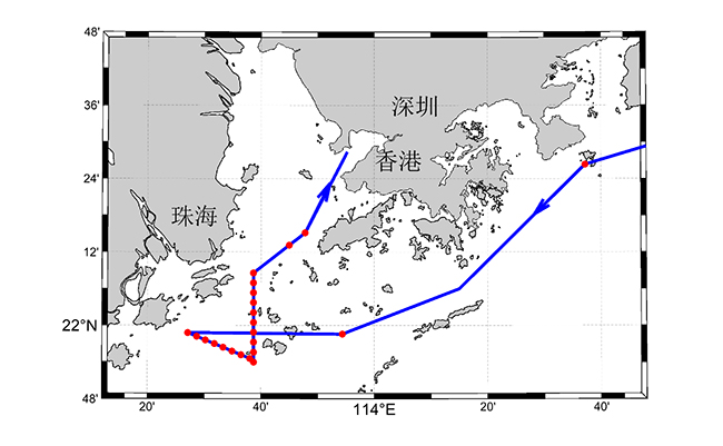 28日,科考队员从学校前往汕尾,进行仪器设备装船和调试。科考船29日清晨从汕尾出发,途径香港南部海域,并于当夜抵达珠海外海。30日进行珠海附近两个主要断面的综合调查,科考船当晚停靠至深圳湾东角头公务码头。