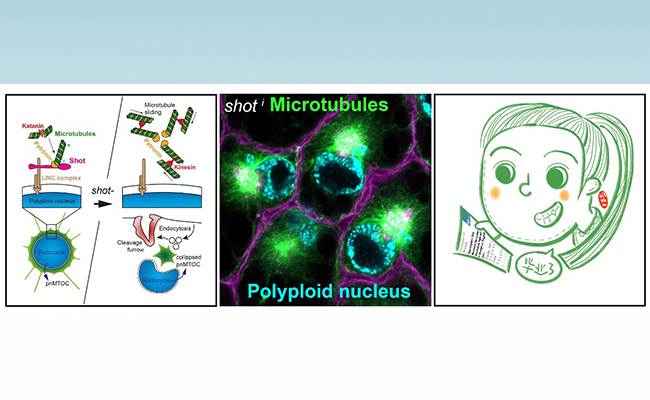 本项研究利用果蝇遗传学,转基因技术,共聚焦显微镜,透射电镜,体外实验,活细胞成像等技术证明了在果蝇幼虫期的多倍体脂肪体细胞以及其他类型的多倍体细胞中均存在核周微管组织中心(Perinuclear MTOC, pnMTOC)。进一步研究发现,微管的缺失会引起细胞核变大和位置偏移,说明核周微管组织中心具有维持细胞核大小和位置的作用。血影斑蛋白Shot是pnMTOC的重要组分,在缺失Shot的多倍体细胞中,核周微管组织中心不再绕核,而是在核周一点形成异常聚集的微管组织中心。进一步的实验表明,这个异常聚集的微管组织中心是通过微管马达蛋白Kinesin介导的微管滑动所形成。与此同时,Shot的缺失使多倍体细胞形成类似于分裂沟的细胞质膜向内凹陷的表型,这说明有丝分裂进程在多倍体细胞中被部分激活。因此,微管的异位聚集能够使非分裂的多倍体细胞试图分裂。