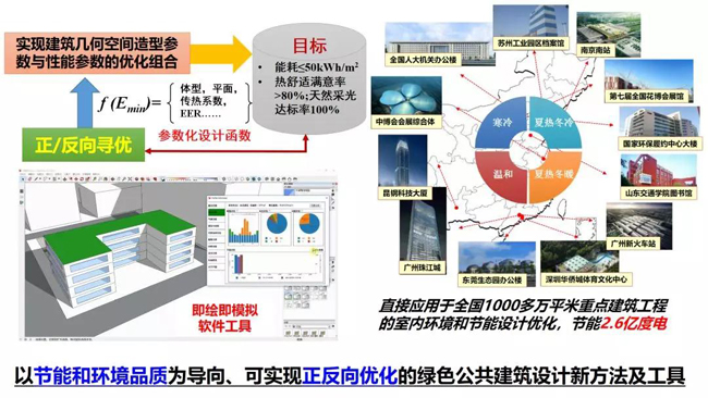 项目简介:如何从设计源头实现公共建筑绿色、节能和健康,是我国新时期绿色发展必须要解决的关键问题之一。项目历时15年研究,建立了以绿色公共建筑环境改善和节能为目标的设计新方法,研发了相应的支撑关键技术。相关成果在北京及全国直接推广应用约5000多万平方米,间接应用约1.4亿平方米。项目研发的设计新方法和新工具在全国4个大型甲级设计院得到应用,经反馈设计效率提高30%以上。