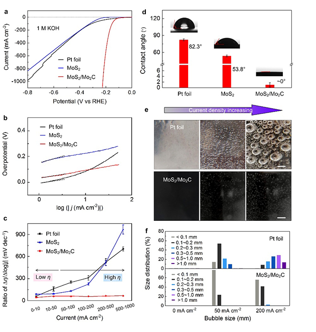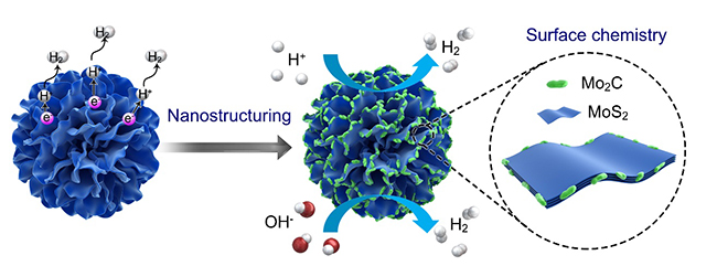 清华新闻网1月18日电 1月17日,清华-伯克利深圳学院刘碧录、邹小龙、成会明团队在《自然·通讯》 (Nature Communications)期刊上在线发表了题为“调控结构及表面化学制备pH普适大电流产氢电催化剂”(Morphology and Surface Chemistry Engineering for pH-Universal Catalysts toward Hydrogen Evolution at Large Current Density)的研究论文。该研究通过设计和制备三种模型电催化剂(包括贵金属Pt、具有微纳结构的MoS2微球、具有微纳结构且表面化学成分优化的MoS2/Mo2C异质结微球),揭示了电催化剂微观结构及表面化学对大电流密度电解水产氢性能的影响。