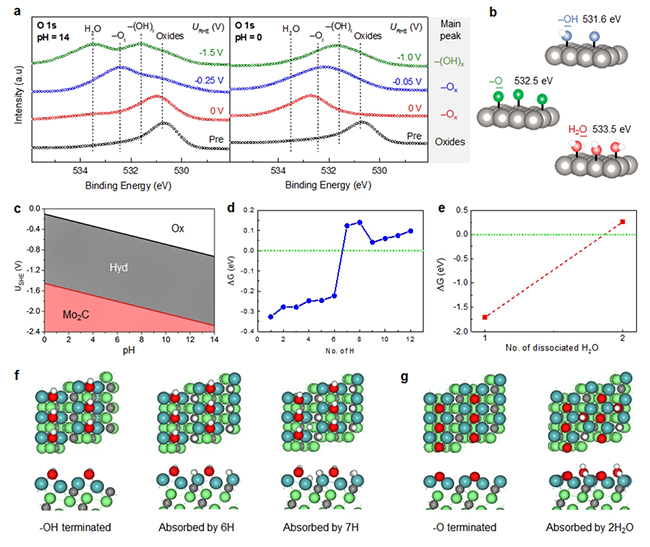 进一步测试表明该催化剂在大电流密度下具有良好的稳定性,表现出很好的实用前景。实验结合理论研究揭示了该催化剂具有优异性能的原因。其一,催化剂的微纳结构设计有利于大电流密度下的快速传质。其二,在不同电化学环境下,催化剂表面具有不同的氧修饰化学成分,使得该催化剂在各种pH环境下均表现出优异的性能。以上研究结果对理解电催化分解水过程中的基础科学问题和高效电解水催化剂的设计具有重要指导意义,相关设计策略有望进一步拓展至其他材料体系和电催化反应中。