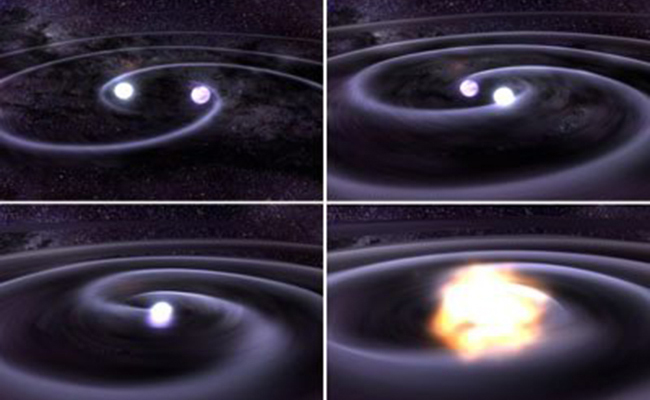 图2上:白矮星吸收非致密伴星物质,达到钱德拉塞卡质量极限发生超新星爆炸(图像来源:STFC/David Hardy)。下:两颗白矮星绕转最终并合爆发为超新星。白色曲线表示两颗白矮星在绕转过程中以引力波形式损失能量,从而逐渐接近直至接触。(图像来源:NASA/Tod Strohmayer (GSFC)/Dana Berry (Chandra X-Ray Observatory))