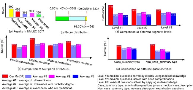 “智医助理”系统 (a)获得456分的高分, (b) 超过了全国96.3%的考生,并在 (c) 基础、临床、预防等科目(人文除外),(d)不同的认知层次,(e)不同的题型(非案例题,案例题) 上均超过了人类考生的平均水平