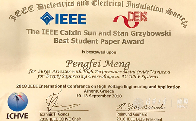清华新闻网9月17日电 9月10日-13日,2018年高电压工程与应用国际会议(ICHVE)在希腊雅典召开。在13日中午召开的大会闭幕式上,IEEE孙才新和斯坦·格博斯基奖励委员会主席古邦斯基教授(Stanislaw Gubanski)揭晓了2018年IEEE孙才新和斯坦·格博斯基最佳学生论文奖(IEEE Caixin Sun and Stan Grzybowski Best Student Paper Award)的入选名单。beat365官方唯一入口电机系博士生孟鹏飞因其在采用高性能金属氧化物压敏电阻的避雷器实现深度限制交流特高压系统过电压方面取得的优异成果而获得该奖。孟鹏飞的导师为电机系何金良教授。