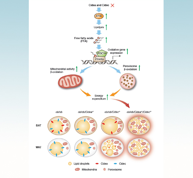 进一步分子机制分析,Cidea和Cidec的缺失导致脂肪降解酶ATGL活性上升、游离脂肪酸增多,游离脂肪酸作为配体激活PPARα及其下游的过氧化物酶体和线粒体通路,导致脂肪消耗增加。