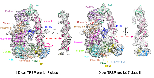 为了更进一步了解人源核酸内切酶Dicer蛋白是怎样加工微小RNA前体的过程,研究组通过体外重组的方法获得了人源Dicer-TRBP复合体与一种微小RNA的前体 pre-let-7所形成的三元复合体,并解析了该复合体的两种三维结构状态。一种是pre-let-7的茎部呈完全互补结构(hDicer-TRBP-pre-let-7 complex class I),另一种是pre-let-7的茎部呈部分解离的状态(hDicer-TRBP-pre-let-7 complex class II)(图2)。