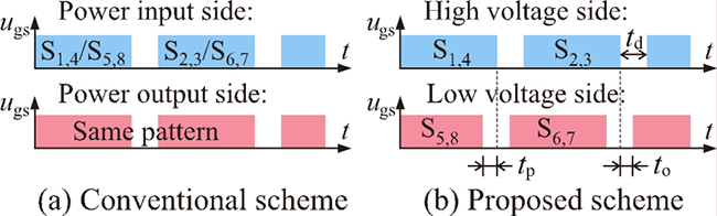针对上述问题,课题组为CLLC谐振变换器设计了一种新型的同步整流策略,即通过主动控制场效应管的开关,取代二极管在电路中的功能。使用场效应管是因为在电力电子变换器中,传输相同的电流,场效应管的损耗显著低于同等级的二极管。采用新型同步整流策略后,变换器的效率可以得到明显的提升。不同于传统的简易同步整流策略,新型同步整流策略创造性地在低电压侧的电力电子开关控制信号中设置了一个微小的相移角(图2所示)。其结果是,在电力电子开关的导通和关断瞬态中,低电压侧电流被强制置零,保证励磁电流的主要分量来源于高电压侧。这一方法不仅降低了低电压侧的电流应力和导通损耗,同时保证了功率双向流动时变换器能具有相同的特性。