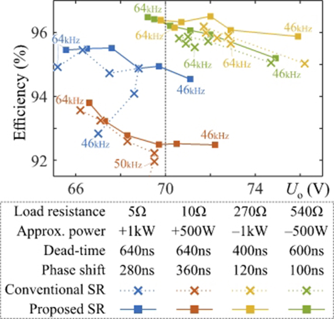 课题组通过实验验证发现,采用新型同步整流策略可以为变换器带来4~6%的效率提升(图3所示),意味着电力电子开关器件损耗产生的总发热量可减少50%。相比于传统的简易同步整流策略,新型同步整流策略不仅进一步将效率提升了一个百分点(总发热量进一步减少25%),并且拥有更大的电压调节范围,实现了功率双向流动的对称性。此外,课题组的这一研究成果,对于电路更简单、应用更广泛的LLC(电感-电感-电容)谐振变换器同样适用。