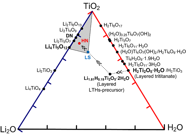 图1. Li2O-TiO2-H2O三元相图及钛酸锂水合物的合成路线图。