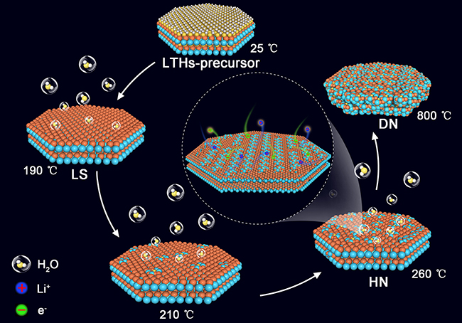 图2. 钛酸锂水合物合成过程及材料快速嵌锂/脱锂过程的示意图。