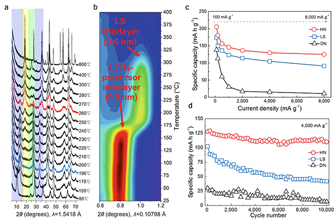 图3. 钛酸锂水合物前驱体在加热脱水过程中的X射线衍射分析(a-b)以及电化学性能对比图(c-d)。