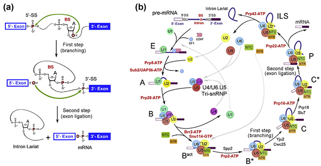 此后,施一公研究组相继解析了5个不同状态剪接体复合物的高分辨率结构,分别是酿酒酵母3.8埃的预组装复合物U4/U6.U5 三小核核糖核蛋白复合物、3.5埃的激活状态复合物Bact complex、3.4埃的第一步催化反应后复合物C complex、4.0埃的第二步催化激活状态下的C* complex,以及本文3.5埃的内含子套索剪接体复合物的结构。这个5个不同状态的剪接体基本覆盖了整个剪接通路中从预组装到激活、从发生两步转酯反应到剪接体的解聚的关键催化步骤,呈现了迄今为止最为清晰的剪接体不同工作状态下的结构信息,将RNA剪接领域的发展推向了新的高度。施一公教授因此于不久前获得未来科学大奖生命医学奖。