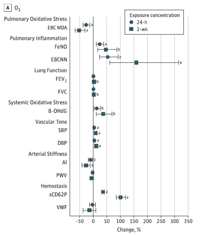 臭氧24小时和2周暴露对人体生物标志物的影响。