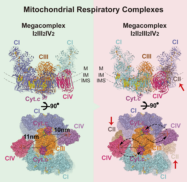 左图上,人源线粒体呼吸链超超级复合物I2III2IV2结构模型;左图下,线粒体膜间隙一侧,复合物III和IV中细胞色素c结合位点。右图上,线粒体呼吸链复合物完整聚合形式预测模型I2II2III2IV2;右图下,线粒体膜间隙一侧,细胞色素c参与电子传递时在复合物III和IV之间的运动路径。Megacomplex,超超级复合物;M线粒体基质;IM,线粒体内膜;IM,线粒体膜间隙;CI,复合物I;CII,复合物II;CIII,复合物III;CIV,复合物IV;Cyt.c,细胞色素c。