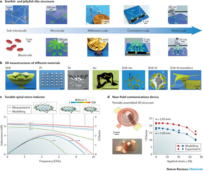 图为力学引导的微尺度三维结构组装方法适用于各个特征尺度和多种材料类型的三维组装。